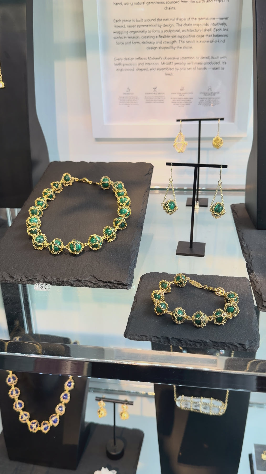 Make a statement in our signature caged malachite gemstone necklace — a sculptural piece that embodies MHART’s balance of strength and form.