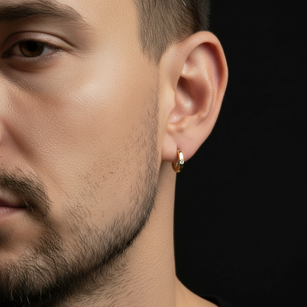 Male Model wearing Tiny Gold Huggie Hoop Earring - Close-up