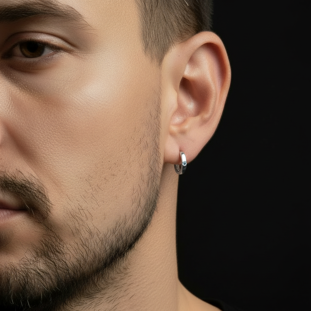 Male Model wearing Tiny Silver Huggie Hoop Earring - Close-up