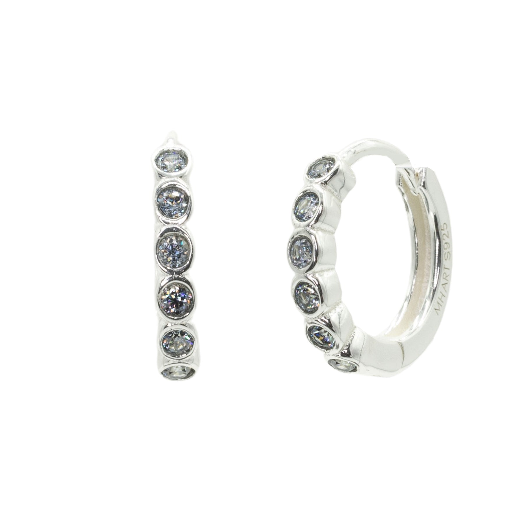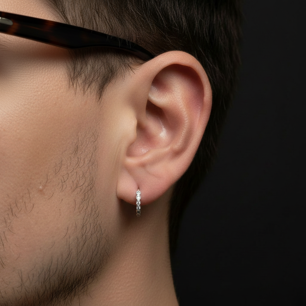 Male Model wearing Tiny Silver Huggie Hoop Earring - Blue Grey Stones