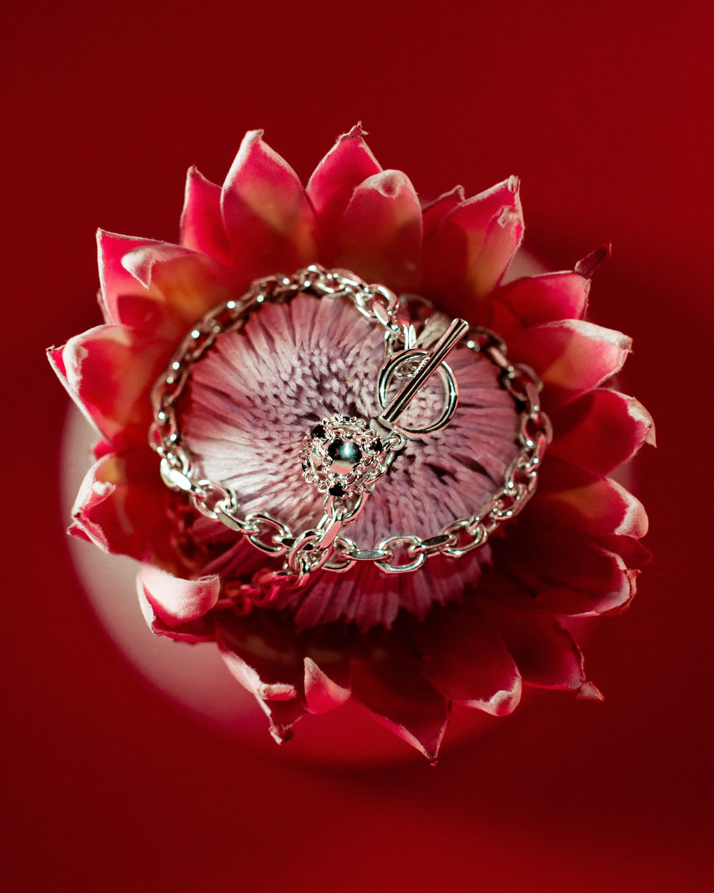 An expression of refined geometry and light. The MHART signature caged sphere is sculpted in solid brass, finished in a vibrant shiny silver, and set with black crystals that shimmer with quiet intensity. The open form captures shadow and reflection in equal measure—an artful play of structure and fluidity.