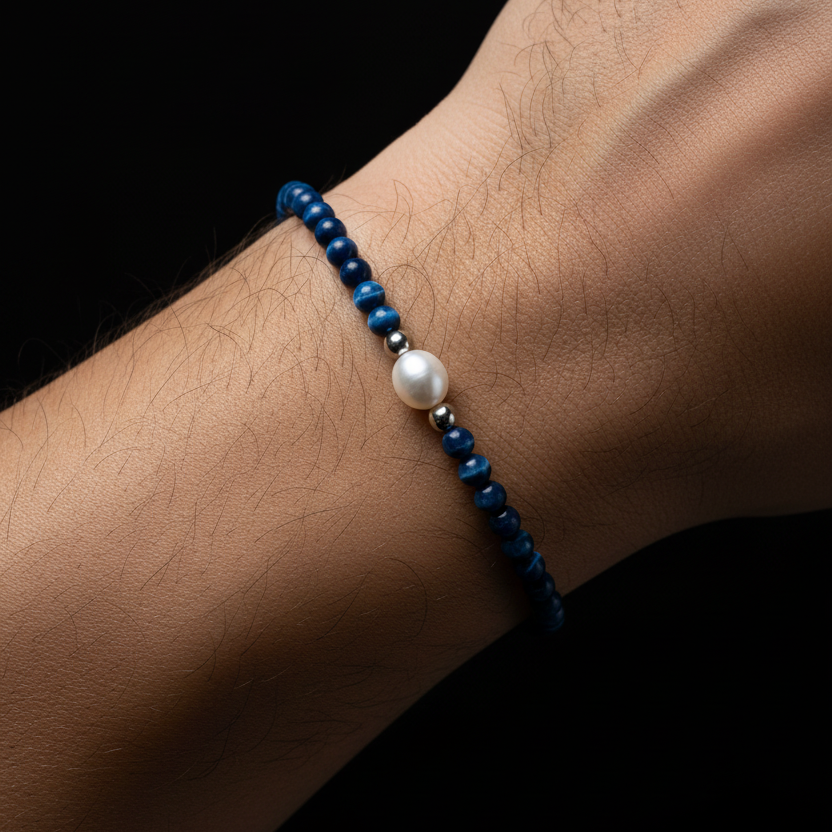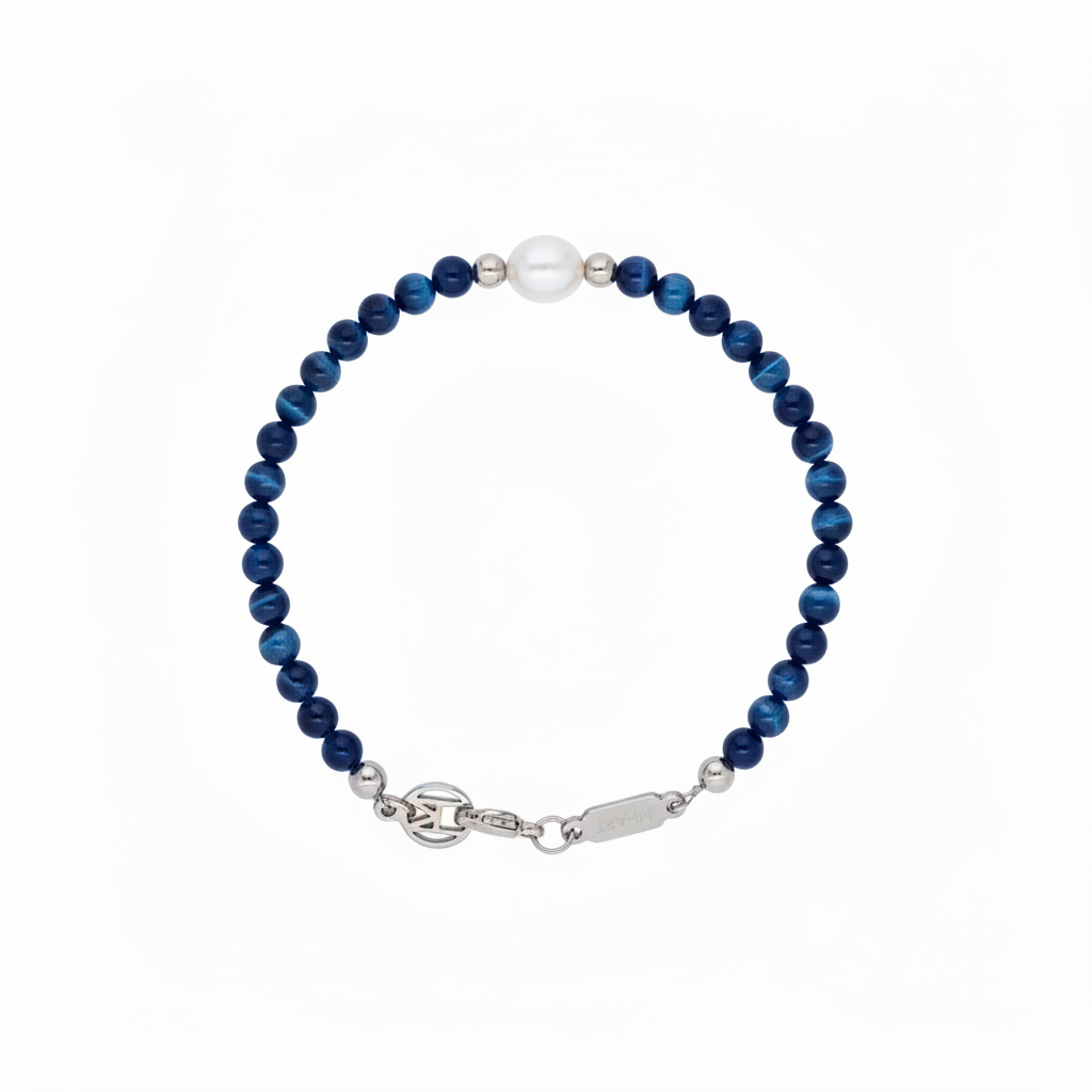 The Blue Tigers Eye Pearl Bracelet merges curated polished blue tiger's eye gemstones with a single freshwater pearl in a refined composition. Each stone is selected for its natural chatoyant striping in deep blue and grey tones, delivering visual depth without compromise. Handcrafted in polished stainless steel with water-resistant stainless steel.