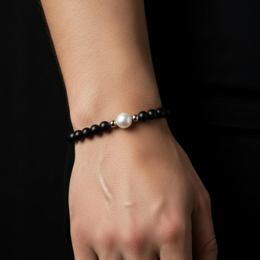 The Onyx Pearl Stretch Bracelet merges curated matte black onyx with a single freshwater pearl in a refined composition. Each stone is selected for depth of color and tactile smoothness, delivering visual restraint without compromise.