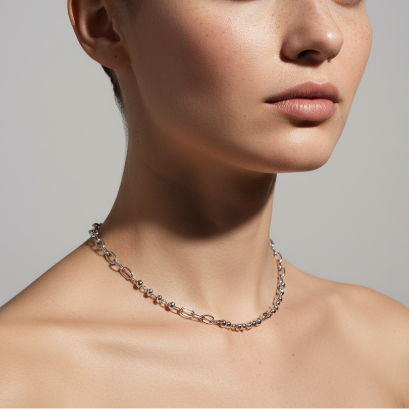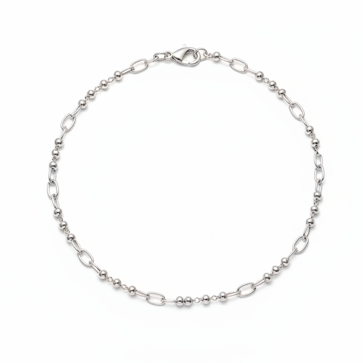 A delicate and refined necklace featuring an alternating pattern of oval-shaped chain links and metal beads. This minimal luxury piece offers a modern take on classic chain jewelry, perfect for everyday wear or layering.