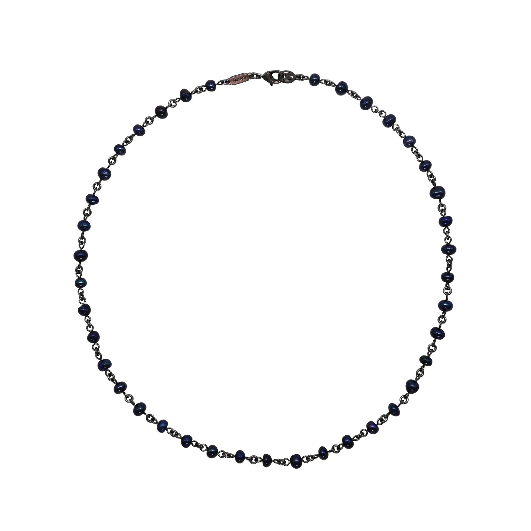 Handmade from black freshwater pearls, this necklace highlights the gentle iridescence of the pearls against matte black plating.