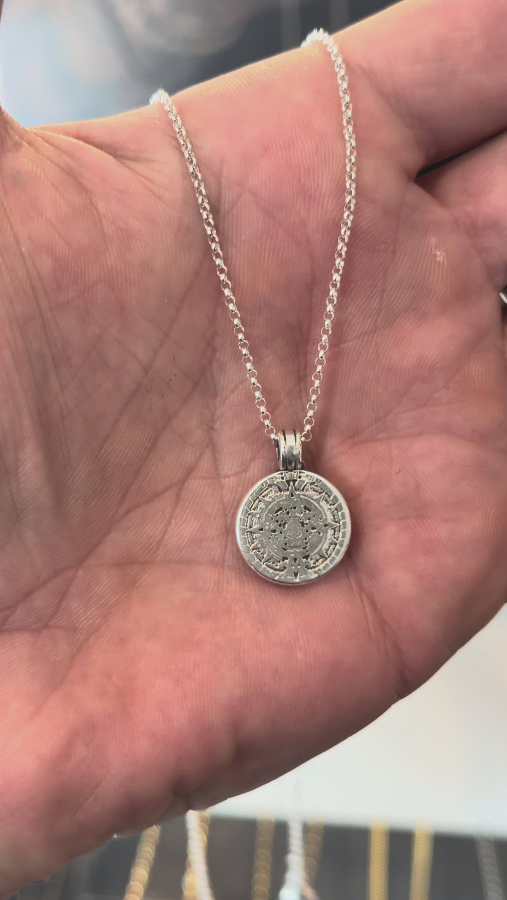 Crafted from .925 sterling silver, this necklace features a bold oxidized silver coin pendant etched with intricate Aztec symbols representing time, ritual, and ancient knowledge.
