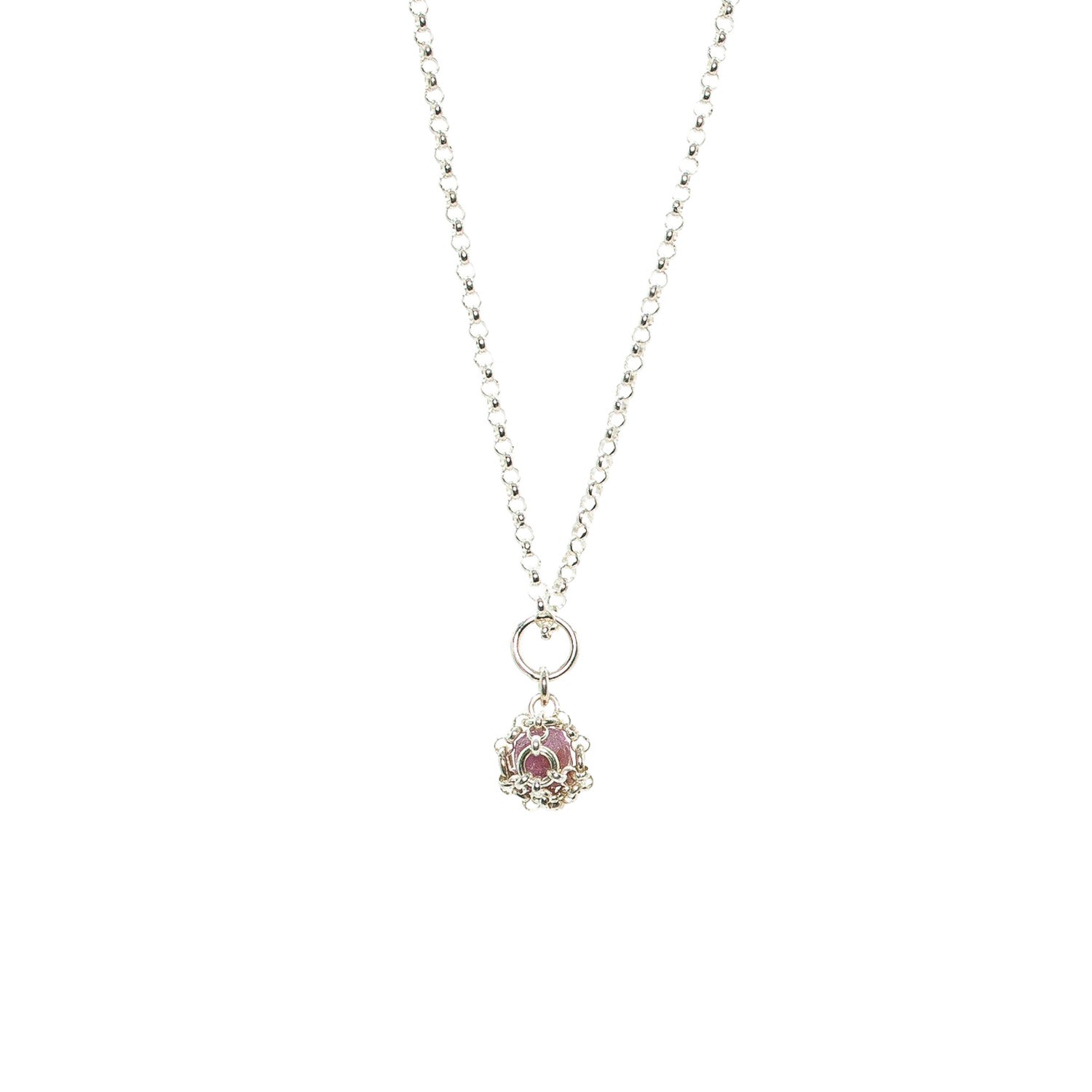 Model wearing Caged Ruby Pendant Necklace - clasp in back, smaller pendant