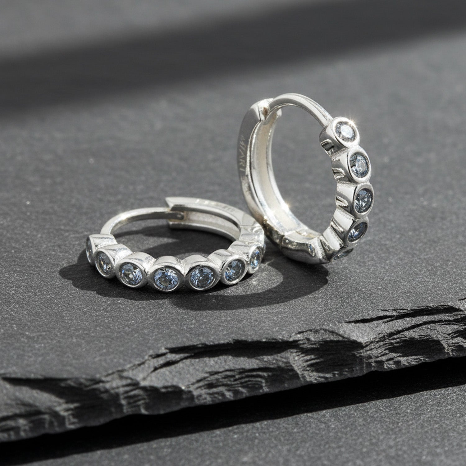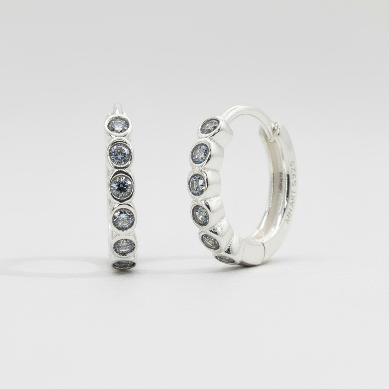 Male Model wearing Tiny Silver Huggie Hoop Earring - Blue Grey Stones