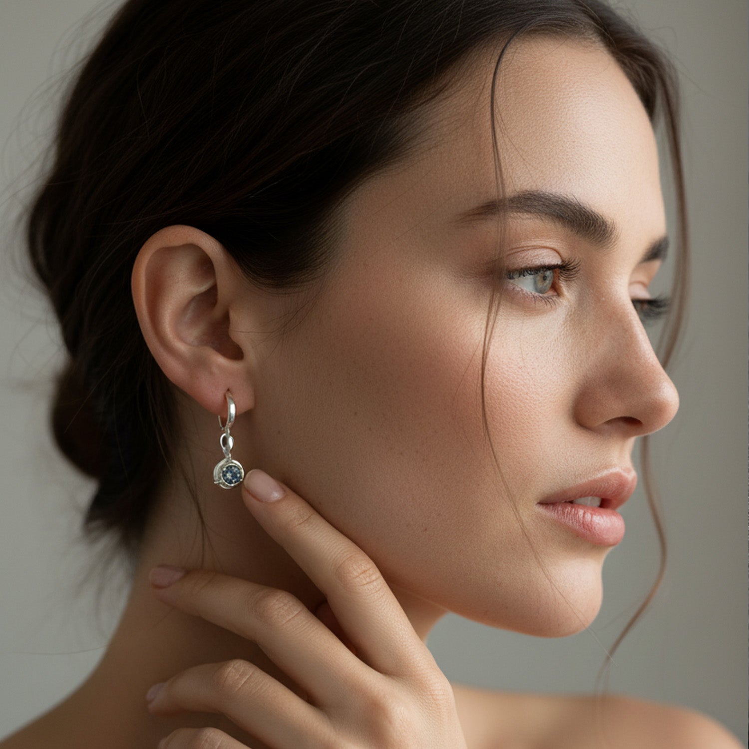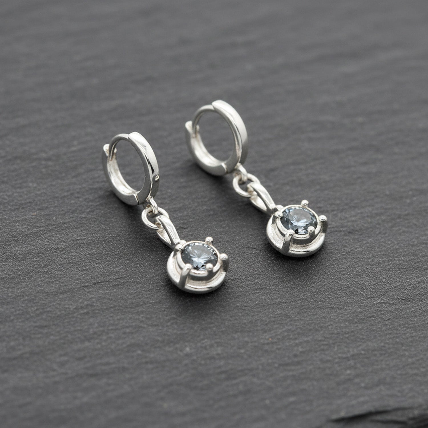 Silver huggie hoops with dark grey-blue moissanite charms