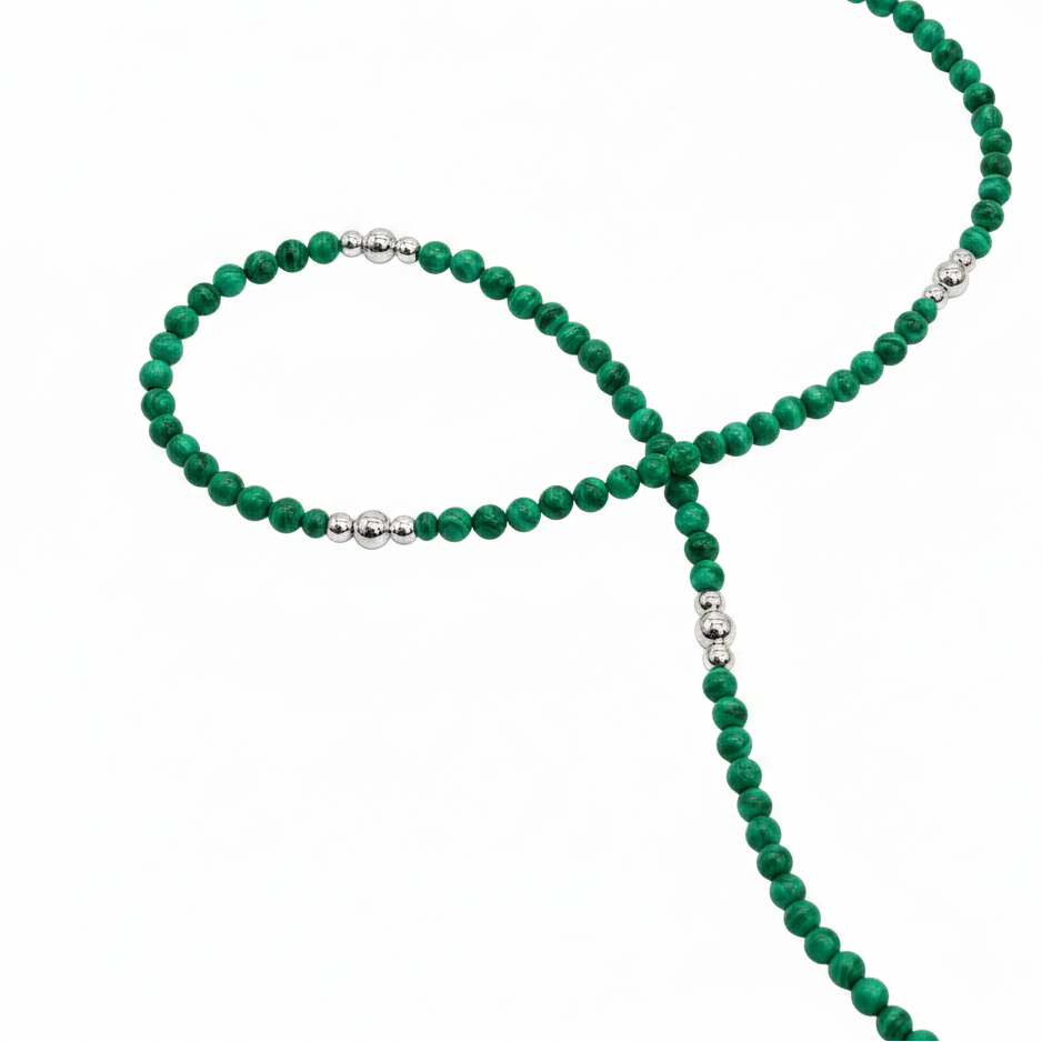This handcrafted necklace features luminous Malachite gemstones, and sterling silver triple set spheres. MHART signature lobster clasp. Wear it long or wrap it twice for a layered look.