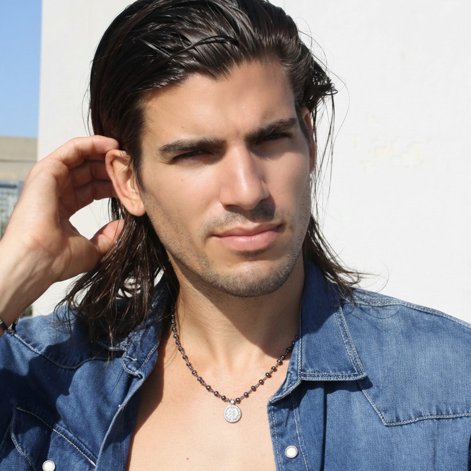 This necklace combines the raw elegance of genuine black freshwater pearls with polished stainless steel and an oxidized sterling silver–plated Aztec coin pendant. Each pearl displays a rich natural luster, revealing hues of midnight, iridescent blue, and deep violet as it catches the light.