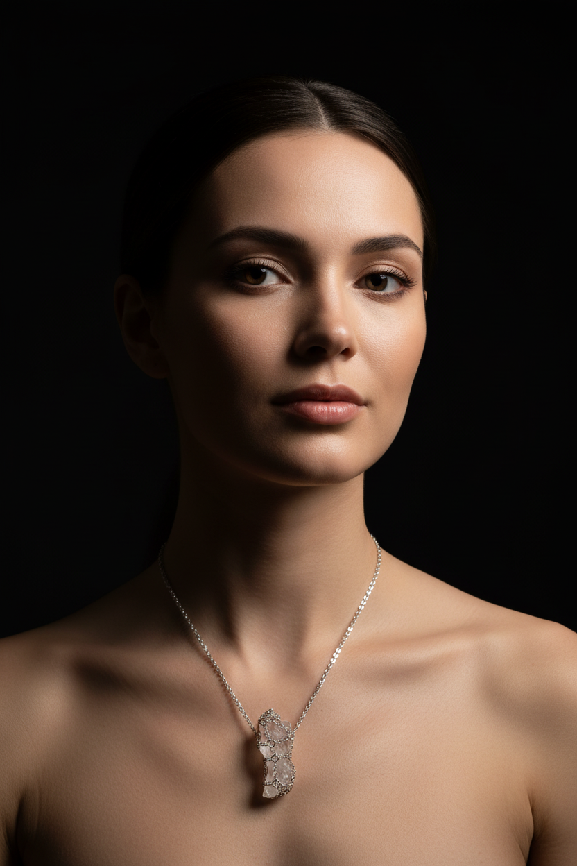 Crafted from .925 sterling silver chain, this one-of-a-kind quartz necklace features a sculptural, web-like design inspired by the geometry of a spider’s web — a symbol of creativity and resilience. The hand-formed silver cage wraps organically around each gemstone, celebrating its natural structure and raw elegance.