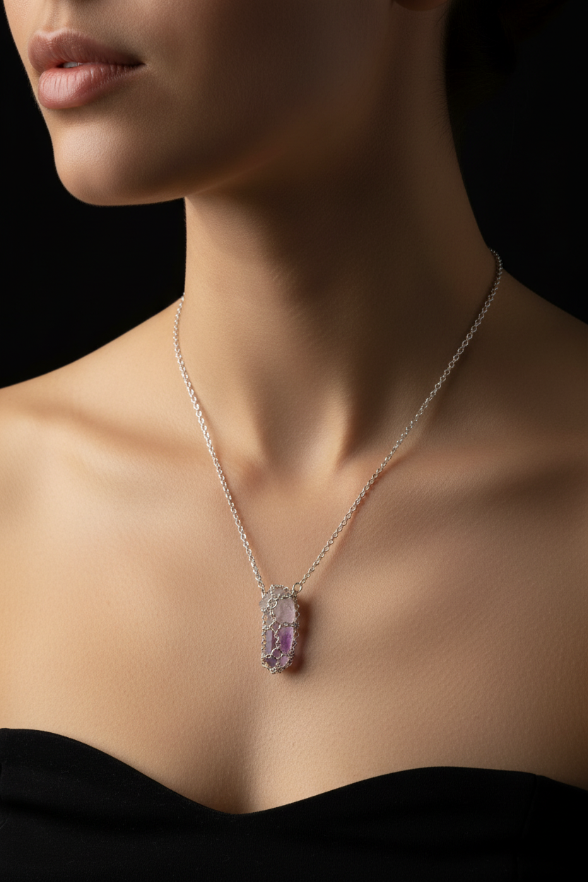 A bold fusion of elegance and edge, the Sterling Silver Caged Amethyst Necklace is a true one-of-a-kind statement piece. Handcrafted in NYC, this design features a raw amethyst gemstone delicately encased in a web of .925 sterling silver chain, mimicking the structure of a spider’s web — a symbol of creativity, strength, and interconnectedness.