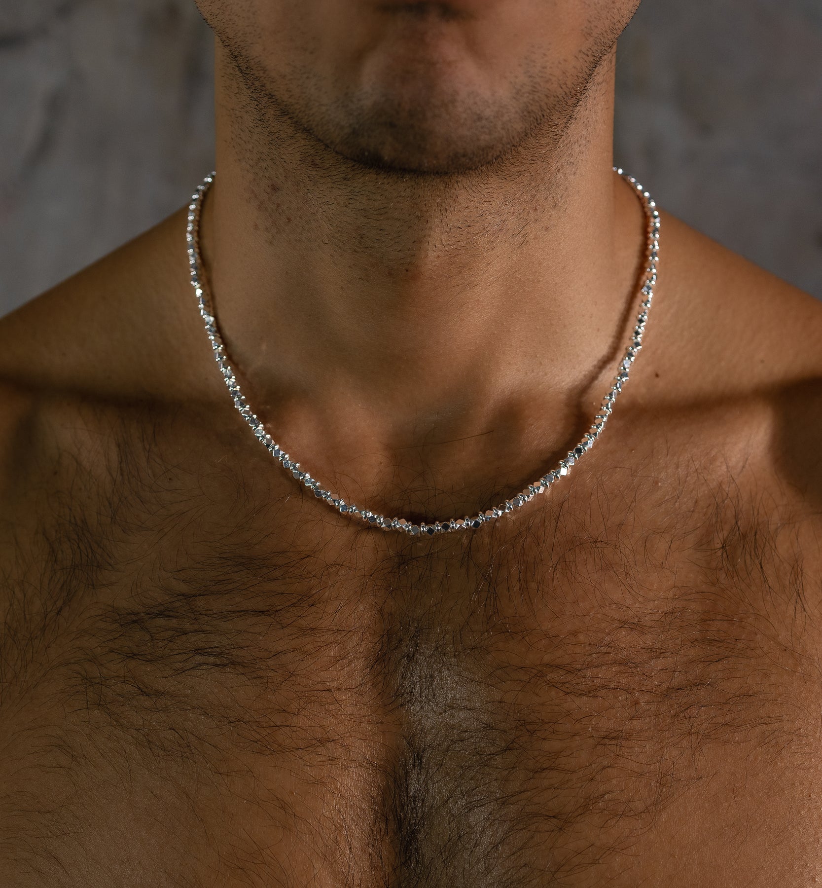 The Silver Dodeca Necklace features polished, twelve-sided faceted beads that capture and reflect light with every movement. Designed to be worn alone for a refined statement or layered for a modern look.