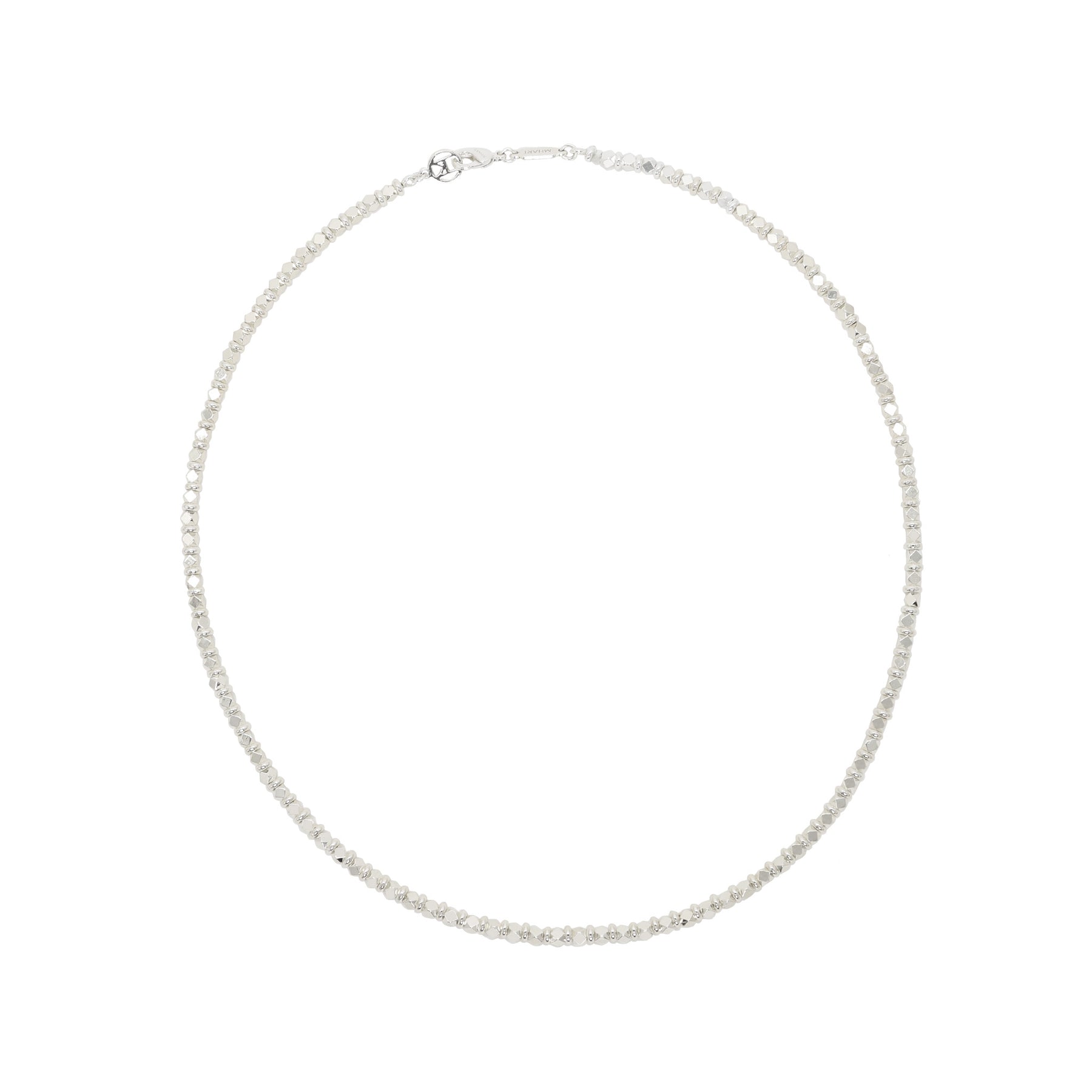 The Silver Dodeca Necklace in shiny silver features twelve-sided faceted beads that catch and reflect light with every movement. Designed to wear solo or layered.