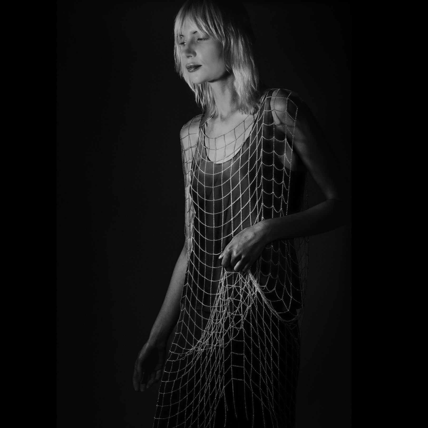 A striking interplay between jewelry and fashion, the Chain Draped Dress redefines the boundaries of adornment and silhouette. Handcrafted from sterling silver-plated brass, this fluid, chain-linked piece is designed to drape effortlessly over a shirt, slip dress, or swimwear—transforming any look into a bold statement.