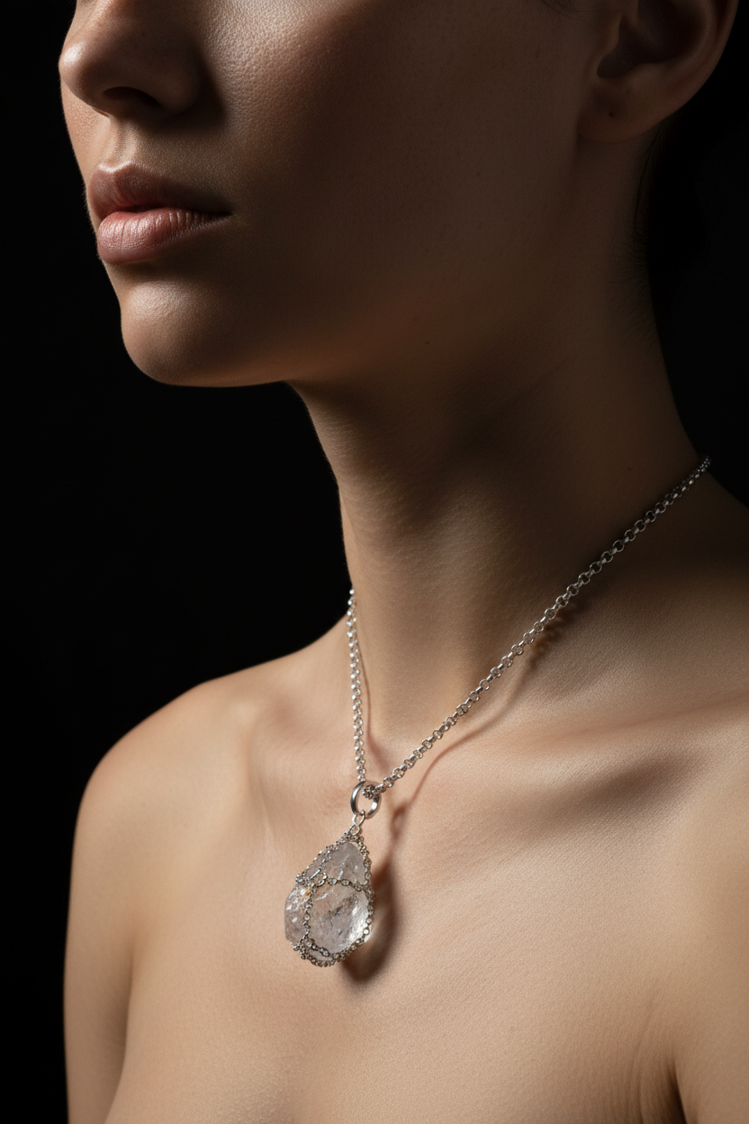 The Caged Quartz Pendant necklace is a statement of craftsmanship, this necklace is made of solid 925 sterling silver and adorned with a one-of-a-kind caged quartz pendant.